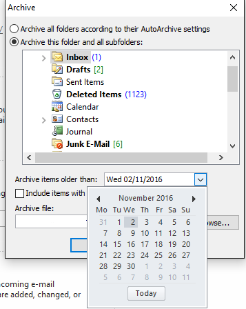 In the Archive window, select the folder you want to archive, and select the date you want to archive emails older than.