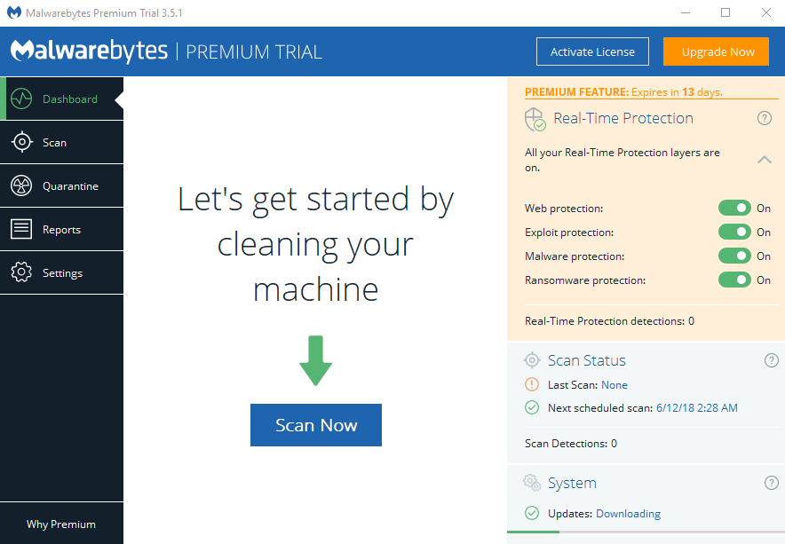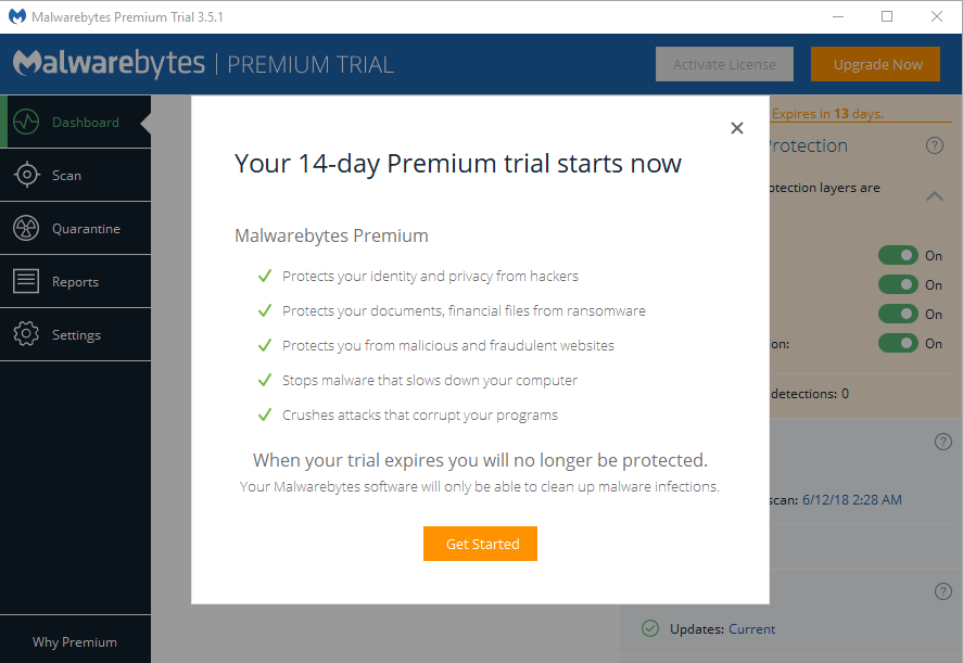 Malwarebytes will now open and prompt you to start a 14 day trial of the premium version.
